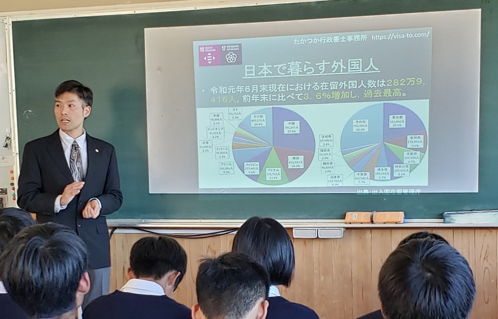 I had an opportunity to talk about “what Gyoseishoshi (immigration law expert) can do for foreigners” at the local high school. This was a part of their study about SDGs and I was invited along with various NGOs.