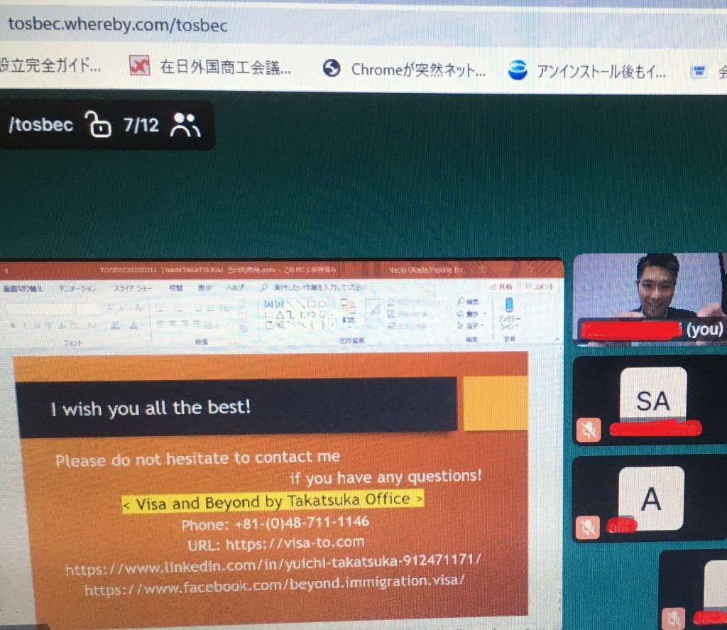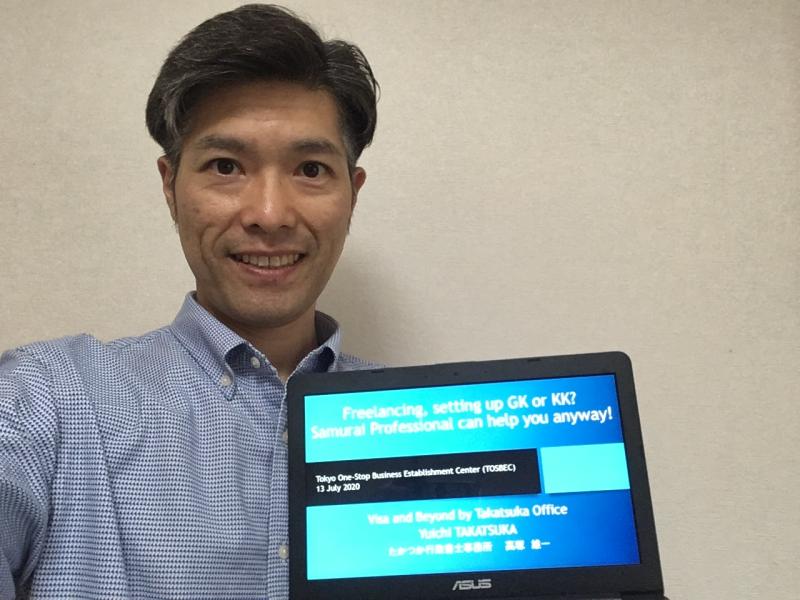 I had another great opportunity to deliver an online seminar for the Tokyo One-Stop Business Establishment Center (TOSBEC, under the Tokyo Metropolitan Government Bureau of Industrial and Labor Affairs). Talking about a company setup, or other than immigration procedures was a new challenge to me, but actually I enjoyed a lot, thanks to my supporters.