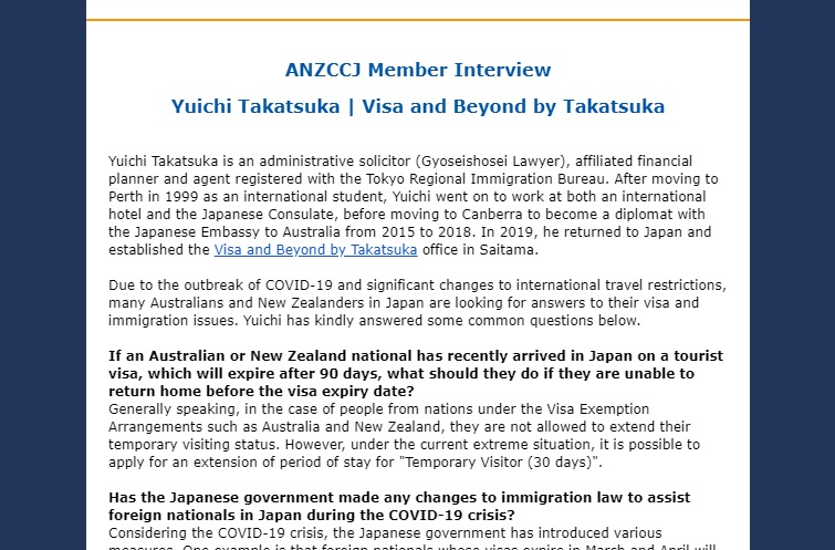 I gave some advice about Japan’s current re-entry measure, to the Australia New Zealand Chamber of Commerce in Japan and their statement has been published (https://anzccj.wildapricot.org/news/9163792).