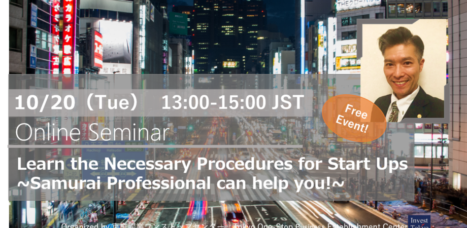 令和2年10月20日(火)、東京都の創業支援機関である東京開業ワンストップセンターのオンラインセミナー(英語)に登壇し、主に合同会社設立や士業の役割についてお話します。