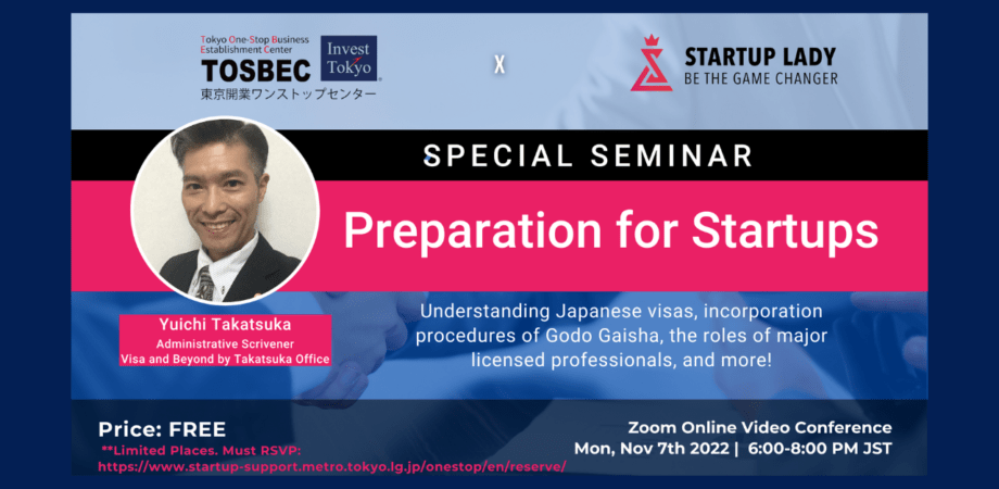 令和4年11月7日(月)、東京都の創業支援機関である東京開業ワンストップセンターのオンラインセミナー(英語)に登壇し、主に会社設立準備についてお話します。